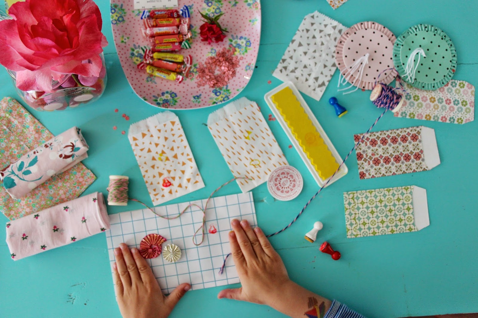 cartes d’invitations My Lovely Thing, petits coupons de tissus pour fabriquer ses set de table, paillettes et rubans pour headband, caissettes à cupcakes, pailles imprimés esprit Liberty, plateau Rice, bocal à bonbons, lanternes, pompons papier Miss Etoile, candy bags et baker twine…