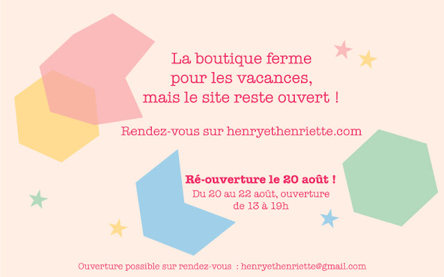 Ouverture possible sur rendez-vous et si vous avez commandé en ligne, il est possible aussi de venir la retirer à la boutique pendant la période de fermeture si vous nous écrivez un mail à henryethenriette@gmail.com !