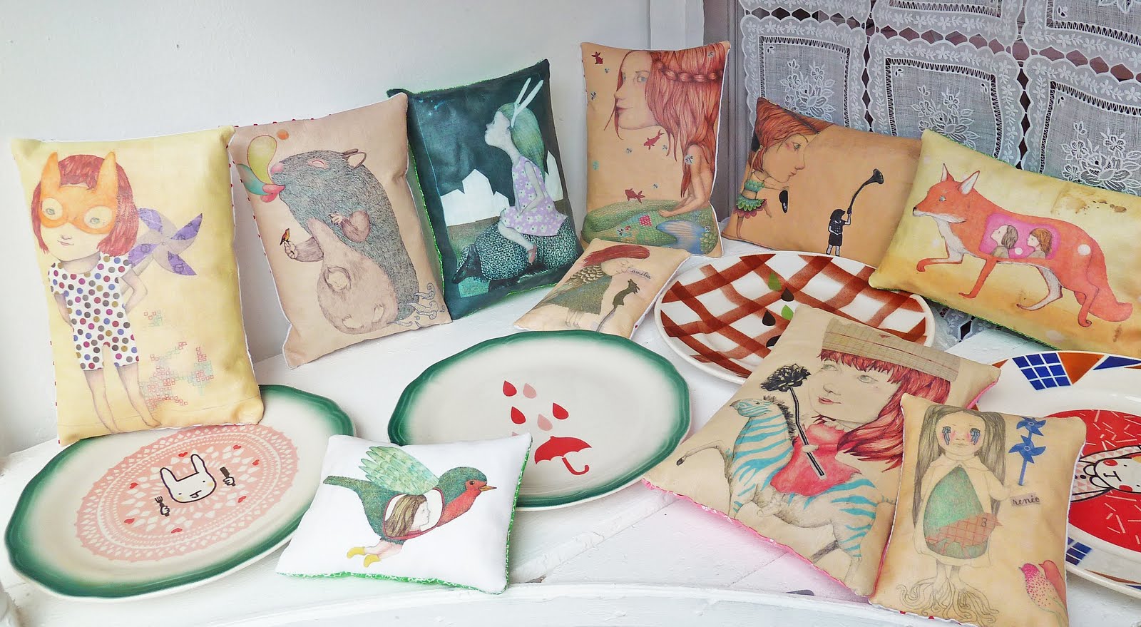 Les « coussins qui ne servent à rien » de Delphine Vaute et les assiettes Lapin Citron